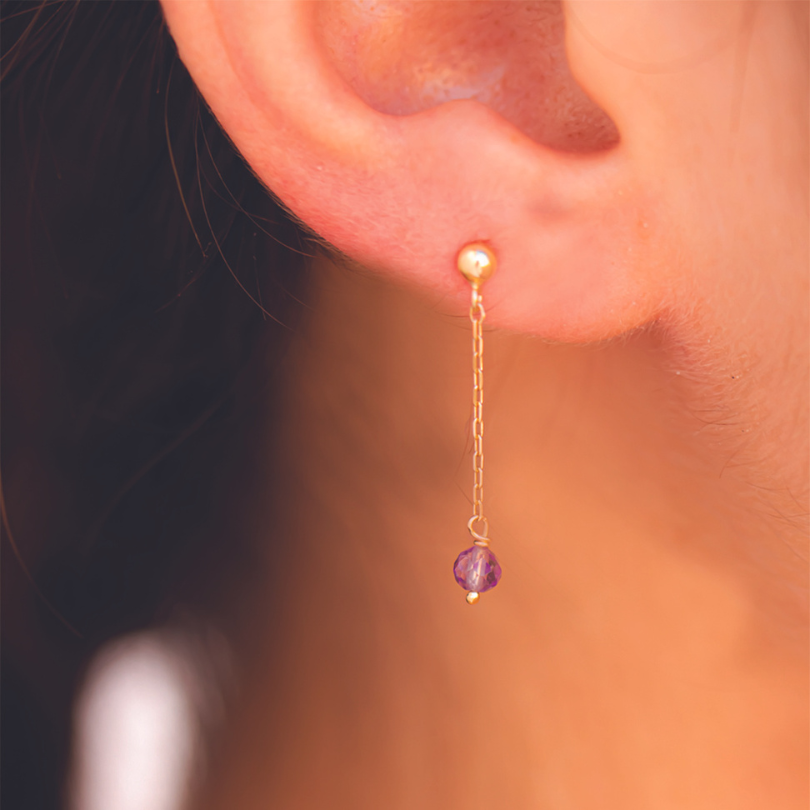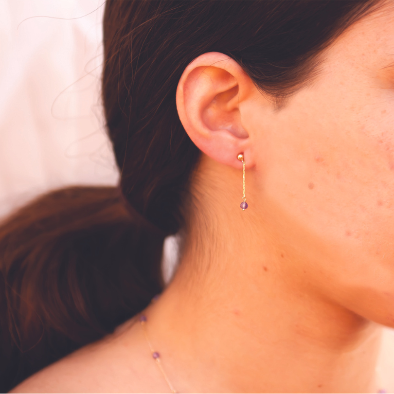These 18 karat gold earrings combine gold and amethyst. Amethyst is a natural stone that brings emotional serenity, common sense, motivation and memory power. At the body and healing level, this stone is perfect for relieving certain pain, caused by physical, psychological and emotional tensions, helping to block geopathic stress. It helps to calm the emotions, helping meditation, eliminating negative energies.