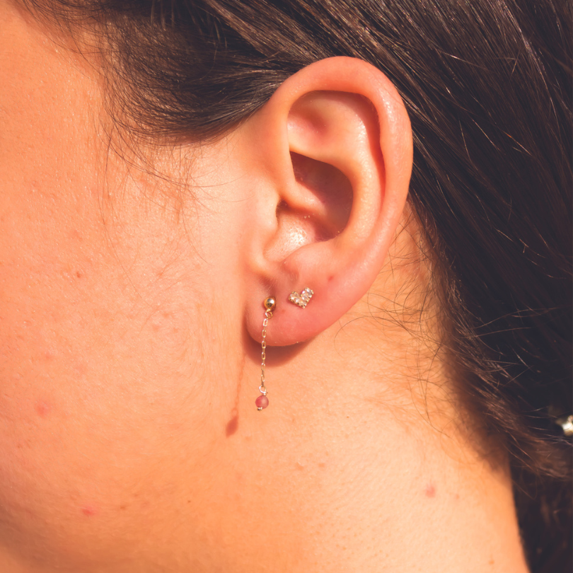 These 18ct gold earrings combine gold and pink tourmaline. A semi-precious gemstone highly valued in jewellery because of its attractive colour. It is a very powerful gemstone for attracting love. It is one of the main gems used to heal, open and balance the Heart Chakra. It helps us to love ourselves and others to love us. It dissolves emotional pain and helps us to move away from self-destructive behaviour.