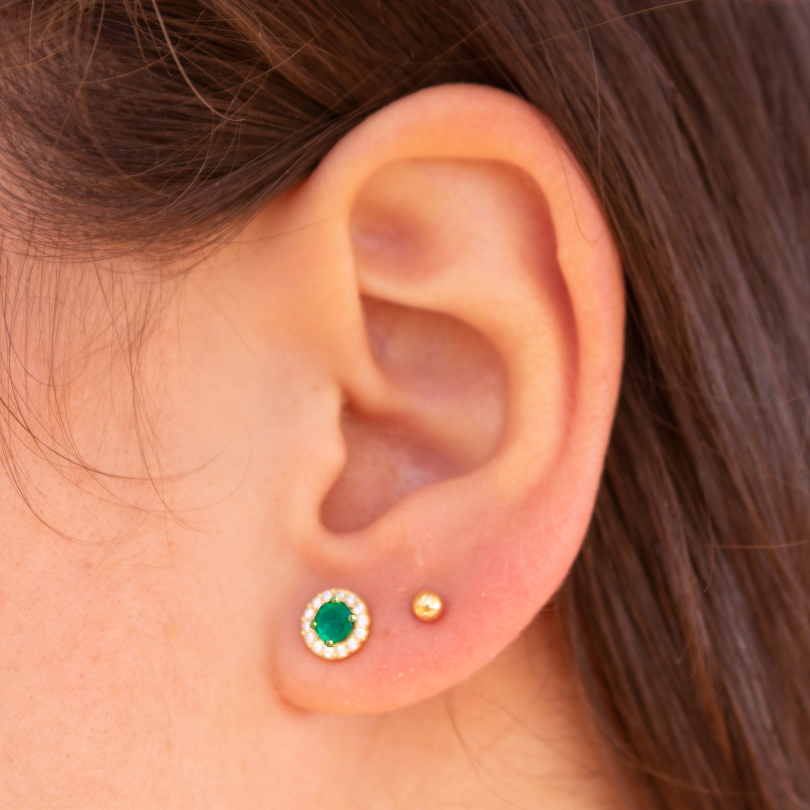 18k gold round earrings with emerald gemstone protagonist, surrounded by small brilliant cut zirconia. Women’s earrings with snap closure.