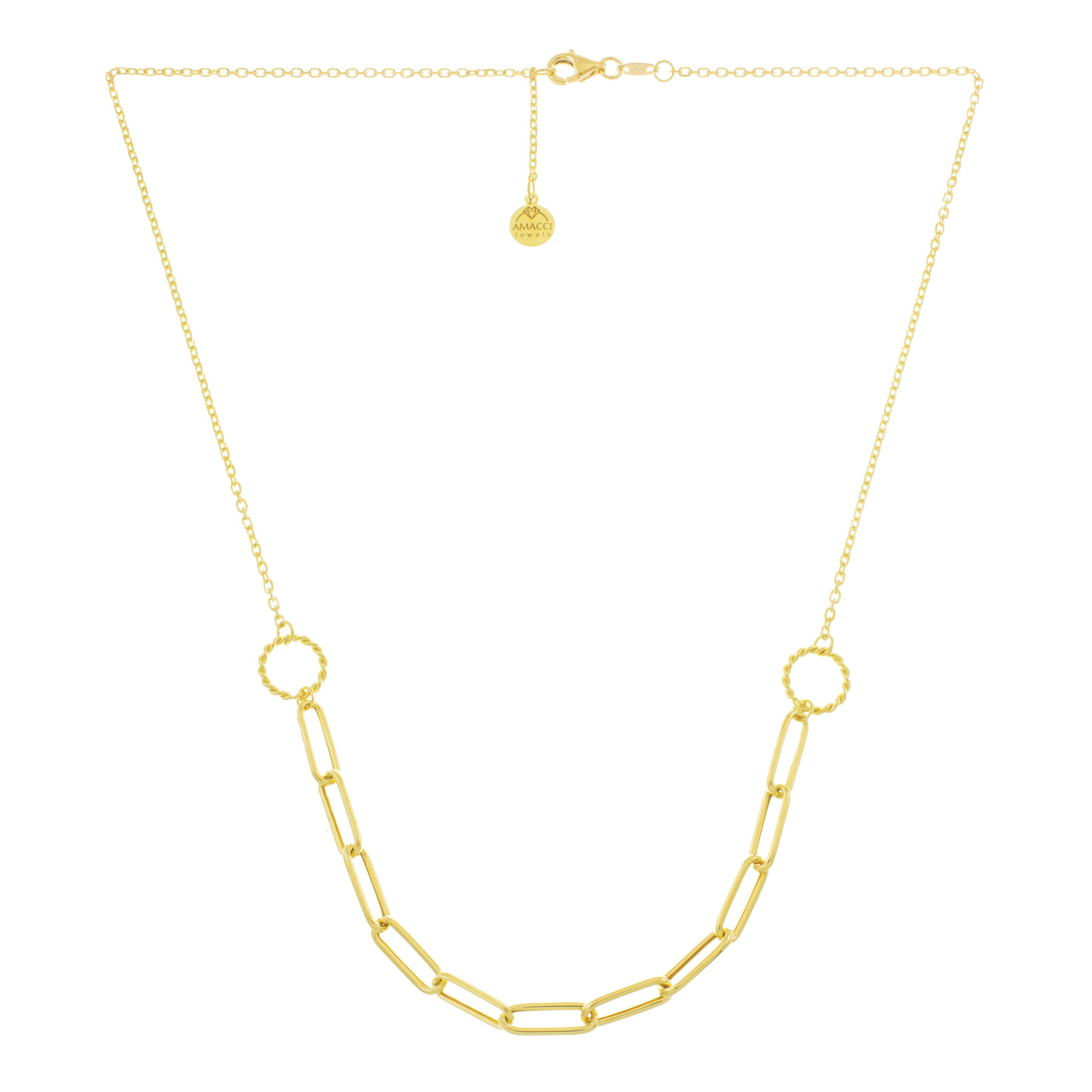 This design combines a 0.40 mm 18 karat gold chain with a central 18 karat gold chain with 11 links and two smooth rings with braided thread on the sides. The chain weighs 4.51 gr