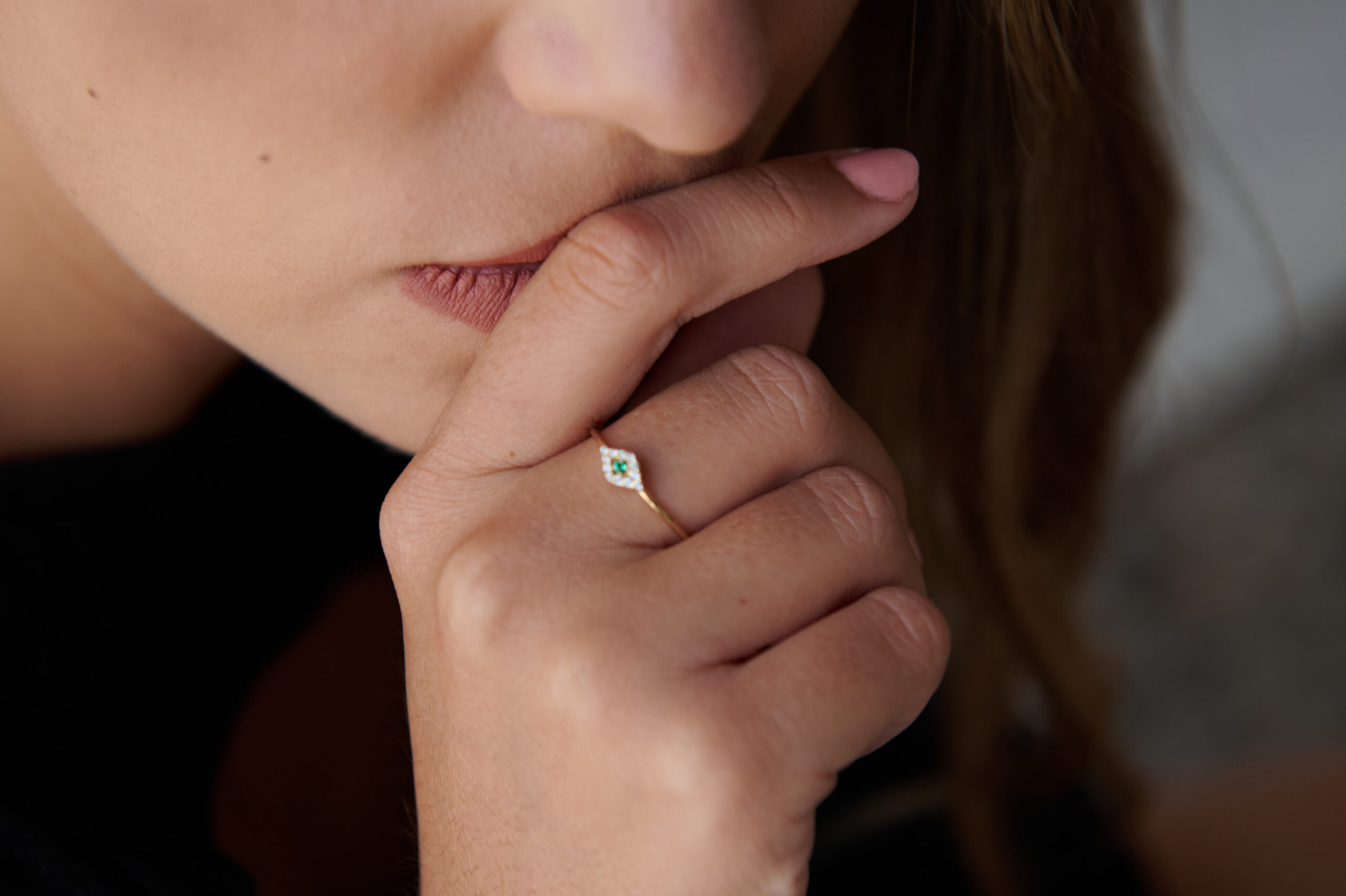 Elegante anillo de hilo con diseño de ojo turco con circonitas blancas combinadas con una circonita central protagonista verde esmeralda en oro amarillo de 18K. Perfecto para ocasiones especiales o para añadir un toque místico de distinción a tus looks