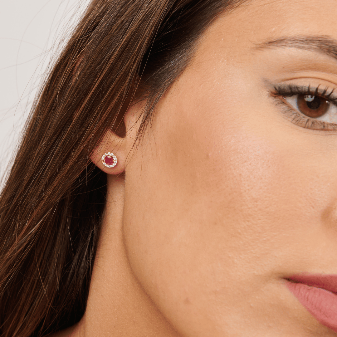 Pendientes redondos de oro 18 quilates con piedra preciosa Rubí protagonista, rodeada de pequeñas circonitas en talla brillante. Pendientes de mujer con cierre de presión
